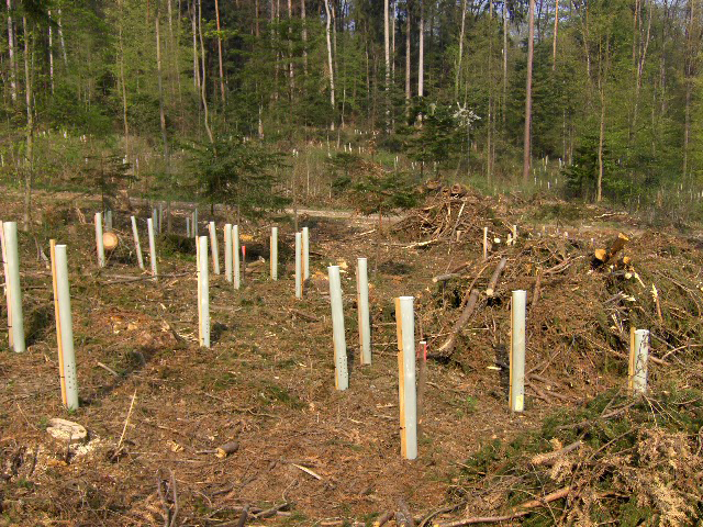 Wildschutz in Form von Einzelschützen werden nur bei seltenen Baumarten, Edellaubhölzer und Eichenpflanzungen aufgestellt. Die Schutzmassnahmen mit Einzelschützen verhindert Konfliktsituation für das Wild, es kann die gesamte Fläche betreten, hilft beim zurückhalten der Konkurrenzvegetation und der Wilddruck verteilt sich auf die ganze Fläche.